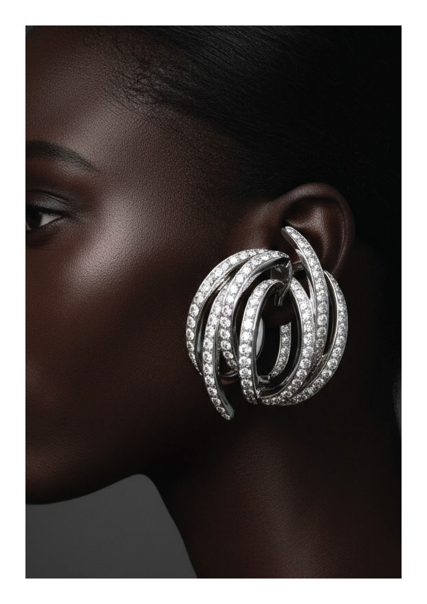 The collection presents an abstract interpretation of the Suprematist movement and draws inspiration from the sculptural work of Bernard Venet. Crafted in white gold and set with white diamonds, the designs focus primarily on earrings, ear cuffs, and a ring.